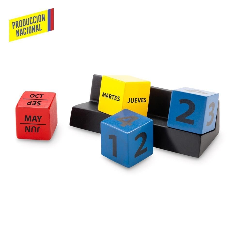 Base elaborada en MDF, con pintura catalizada, incluye 4 cubos (1 amarillo, 1 rojo y 2 azules) con dias de la semana, meses y con numero del dia. Empaque caja Individual. Medidas: 12 cm x 4.5 cm x 4.5 cm Marca: 4 cm / Tampografía / Láser