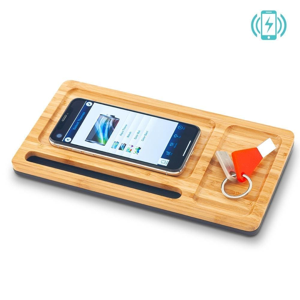 Tabla multiorganizadora de escritorio en bambú con cargador inalámbrico. Empaque caja individual. Medidas: 25.5 cm x 13.5 cm x 1.1 cm Marca: 5 cm / Láser