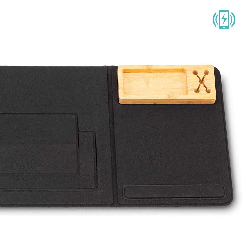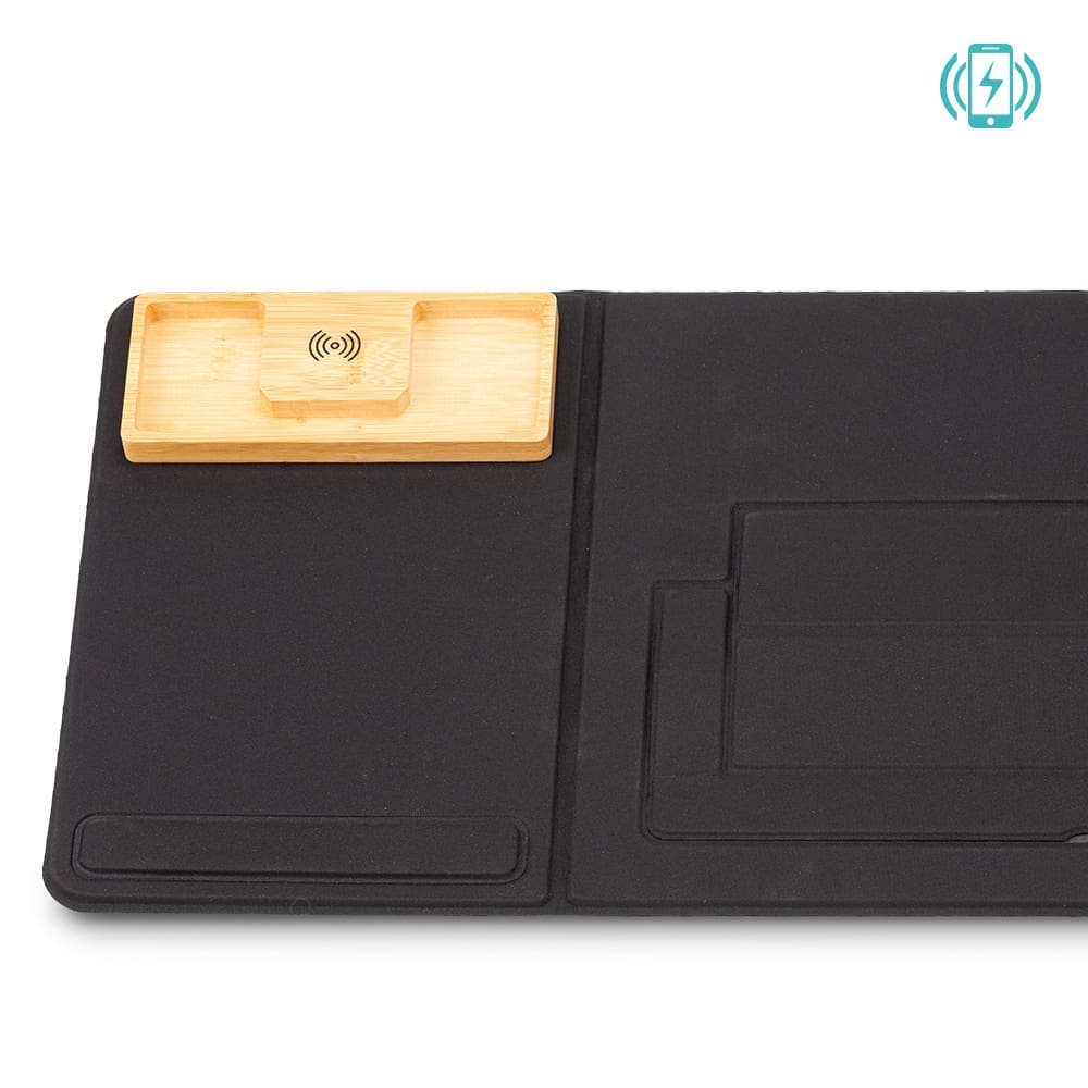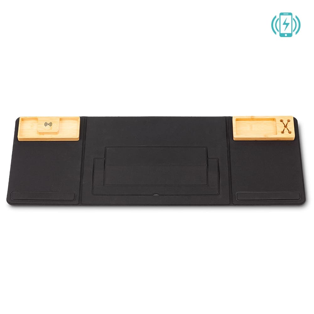 Estación portátil de trabajo plegable, con soporte para laptop de hasta 14”, mouse pad, cargador inalámbrico y organizador de elementos pequeños. Medidas: Cerrado 40 cm x 30 cm / Abierto 80 cm x 30 cm Marca: 15 cm / Screen / 7 cm / Láser